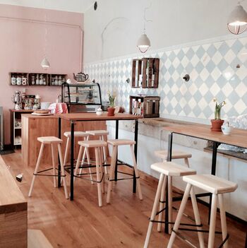 Der alte Pferdestall ist heute der Thekenraum des Schloss Cafés. Historische Fliesen, der Fußboden aus Rübenbrandziegeln und die Natursteintränken erinnern an die alte Nutzung. Die Designer von Wiederverwandt haben eigene Möbel für diesen Raum entworfen.